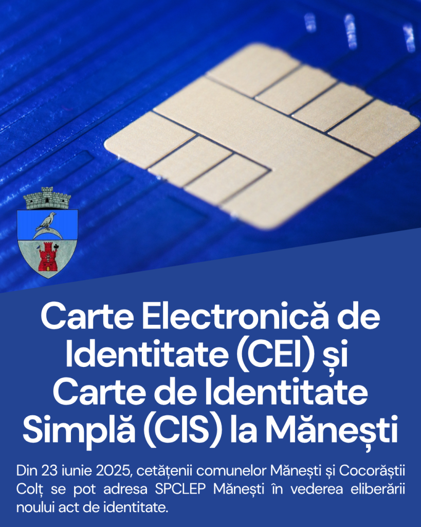 Începând cu luni, 26 iunie 2025, la Serviciul Public Comunitar Local de Evidență a Persoanelor (SPCLEP) Mănești se eliberează: